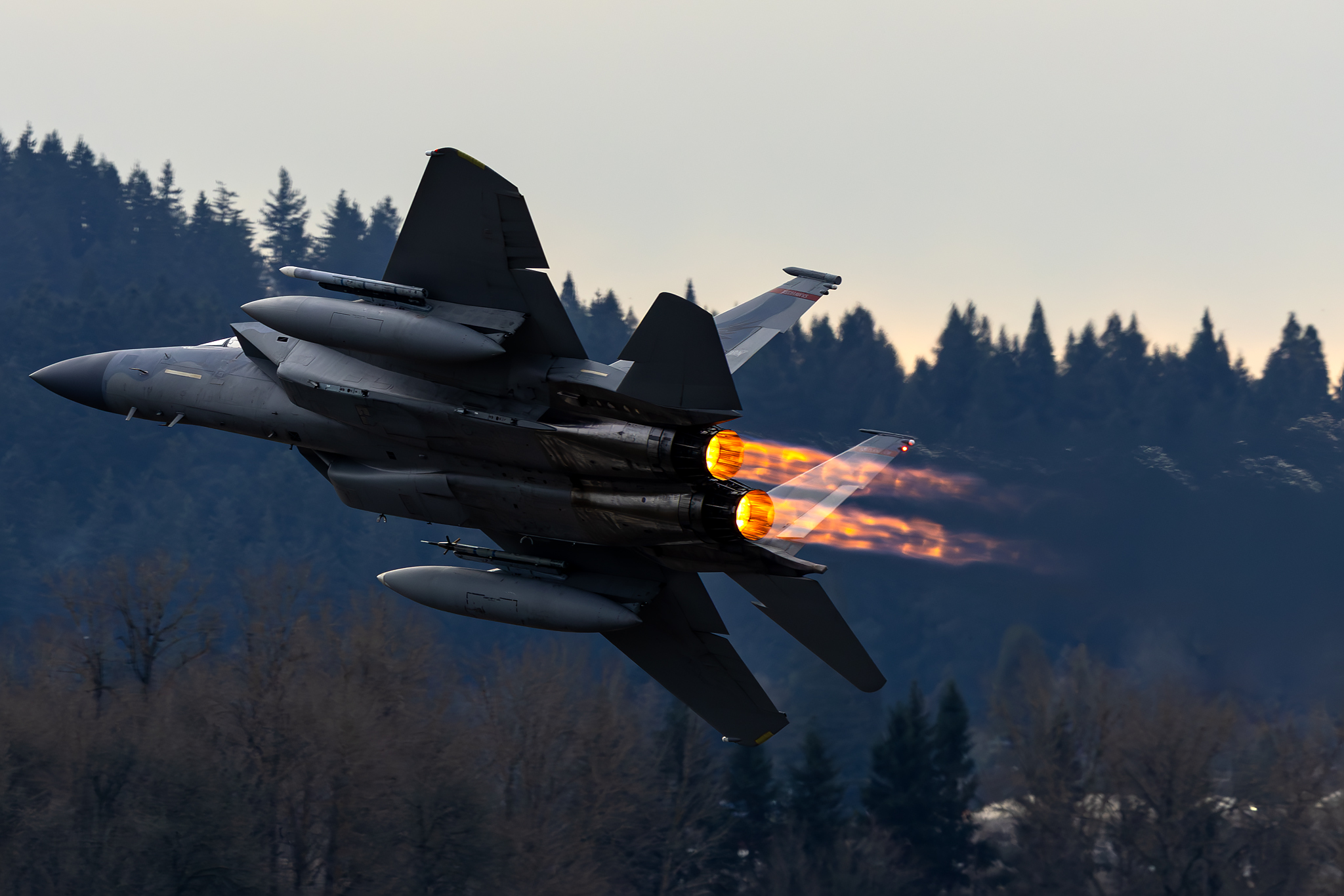 Il convient de noter que l’utilisation de la postcombustion par les F-15 basés sur PANG n’est pas quotidienne. Cela est dû en grande partie à la réduction du bruit et aux économies de carburant, ainsi qu'aux longues pistes de l'aéroport. Mais pour certaines missions, comme lors du décollage des oiseaux d'alerte, ou lors d'un vol d'essai fonctionnel, ou pour une occasion spéciale, comme ce vol final, les F-15 descendent la piste en pleine réchauffage, exécutant souvent une « montée de porte » (une montée verticale à peu près au-dessus du terrain de l'aéroport) à l'extrémité de la piste. C'est vraiment quelque chose à voir, et surtout entendreà l'intérieur du terminal, où des foules de voyageurs fatigués reçoivent un réveil soudain alors que le chahut fait littéralement trembler les fenêtres.