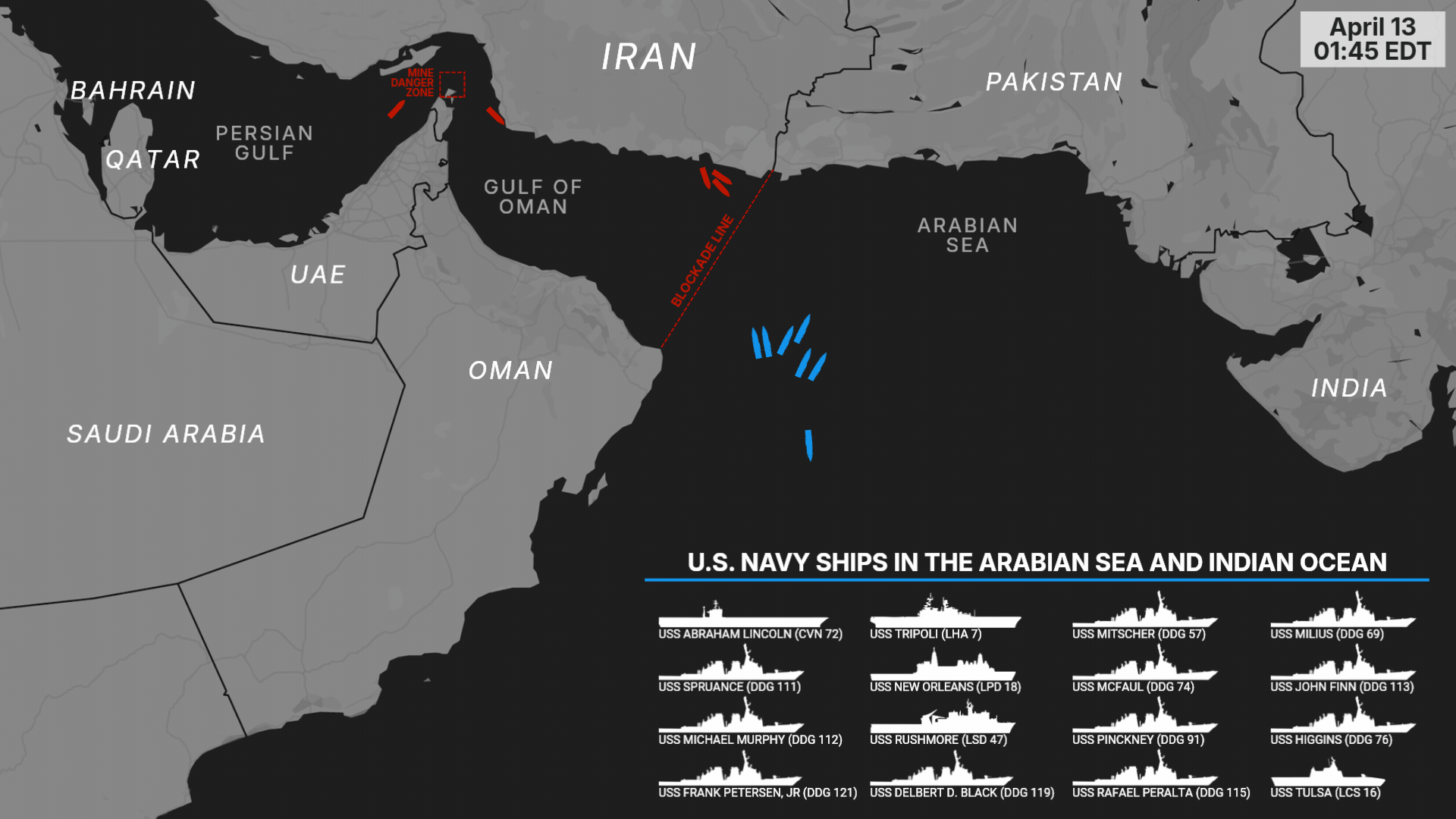 Le Tripoli L’ARG soutient également les mesures de blocus, avec la 31e Marine Expeditionary Unit (MEU) abordant et saisissant le M/V Touska battant pavillon iranien le 19 avril après USS Spruce a tiré plusieurs obus de 5 pouces, ciblant la salle des machines et désactivant la propulsion du navire. « Les forces américaines ont émis de multiples avertissements et ont informé le navire battant pavillon iranien qu’il violait le blocus américain. Après que l’équipage de Touska n’ait pas répondu aux avertissements répétés pendant une période de six heures, Spruce a ordonné au navire d’évacuer sa salle des machines. Le deuxième ARG-MEU chargé du CENTCOM, le Boxeur L’ARG-11th MEU transite actuellement par le Commandement américain pour l’Indo-Pacifique dans un lieu tenu secret.