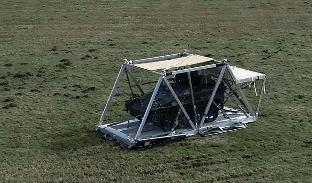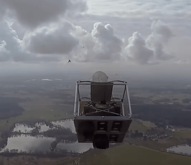 La vidéo montre le Wiesel chenillé chargé pour la première fois dans la soute d’un A400M au sein de sa « cage », le système de parachute ATAX du constructeur britannique IrvinGQ. La charge descend ensuite de la rampe arrière de l’avion et descend sous trois parachutes. Les airbags amortisseurs réutilisables sous la cage permettent un atterrissage plus doux. Les soldats conduisent ensuite le véhicule directement de la palette, sans aucune préparation majeure.