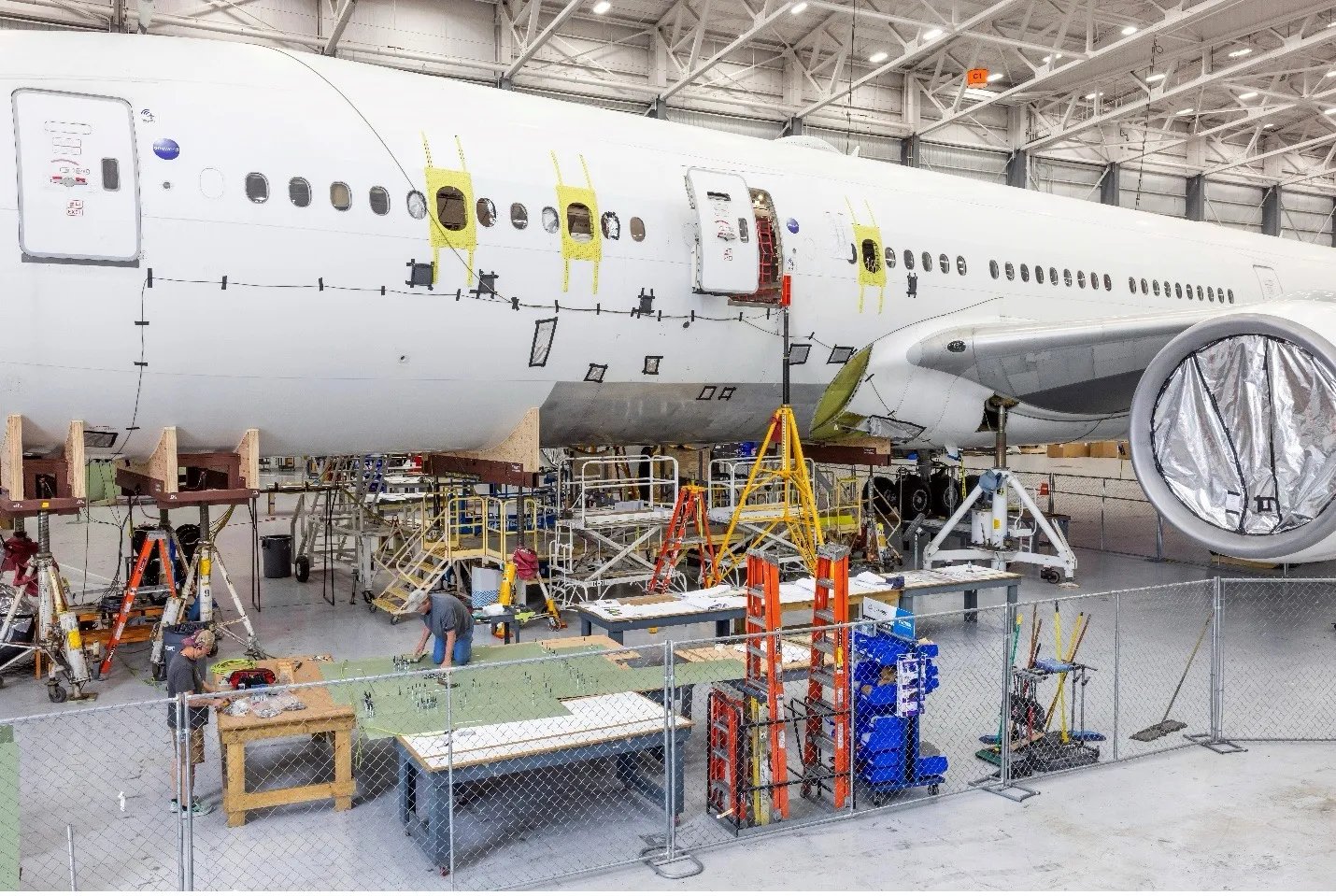 À Waco, le 777 a subi des modifications, notamment l’installation de stations de recherche dédiées et un câblage étendu. Des faisceaux de câbles traversant le fuselage sont nécessaires pour permettre aux postes de travail des opérateurs de communiquer avec des capteurs tels que le LIDAR et les spectromètres d’imagerie infrarouge pendant les vols.