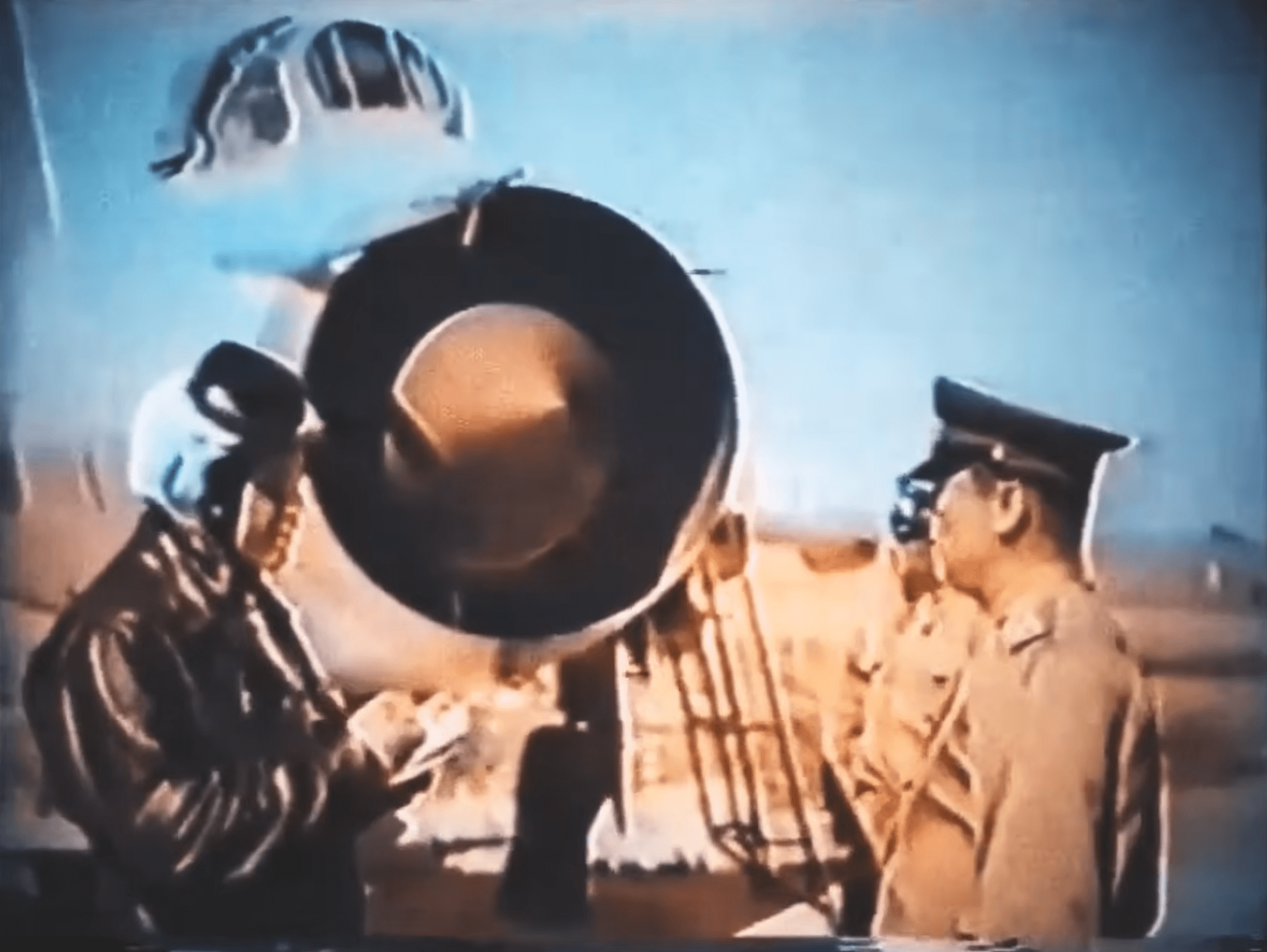Shein a fait monter le jet à un angle d’environ 45 degrés. Il s’agissait d’une manœuvre de lancer « par-dessus l’épaule », typique des chasseurs-bombardiers de cette époque. Cela impliquait que l’avion attaquant tirait vers le haut avant de larguer sa bombe pour compenser la chute de gravité de l’arme en vol. Le résultat permettrait de placer l’arme sur la cible, sans que l’avion n’ait besoin de la survoler. Au lieu de cela, le jet effectuerait un demi-tonneau et (espérons-le) éviterait les effets de l’explosion afin de pouvoir s’échapper. La séquence de manœuvre de lancement, telle que montrée dans la vidéo, est apparemment simulée, ou du moins fortement modifiée.